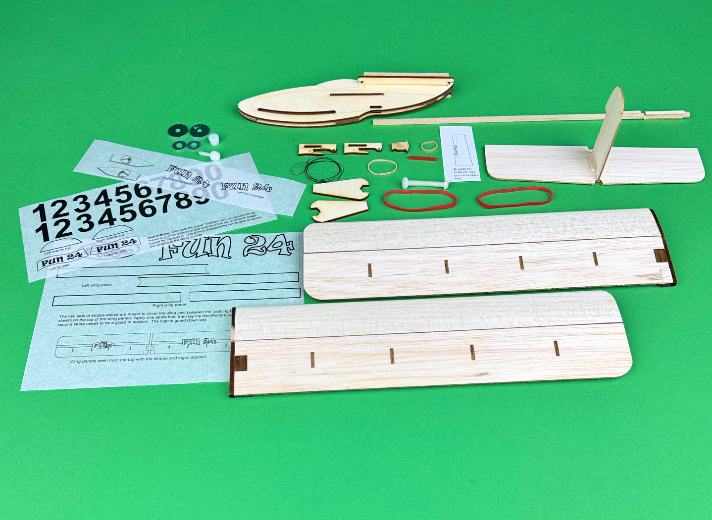 Includes: You receive one factory assembled and lightly sanded Fun 24 Fuselage Assembly. Also included are a couple of launch hooks with launch hook holders, launch hood string, shifteable ballast thumb screw and thumb nut along with an assortment of ballast washers, paper decoration for the fuselage and small rubber bands.