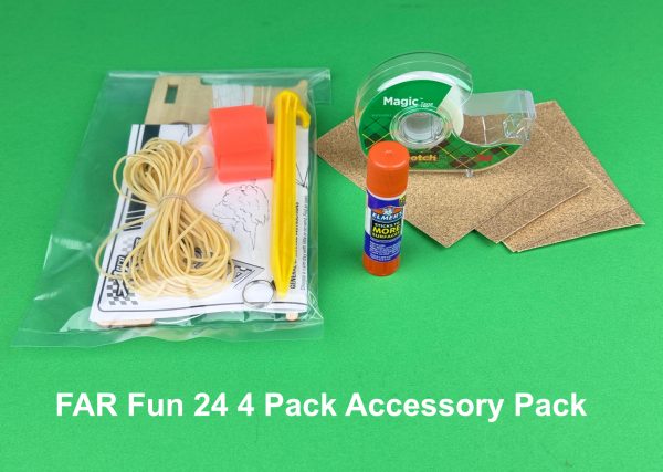 Includes: 4 Factory Built FAR Fun 24 gliders, sandpaper, scotch tape, Elmer’s Purple Disappearing glue stick and one Short Field High Start Deluxe version.